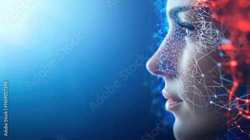 Digital portrait of woman with network of lines and nodes representing artificial intelligence, showcasing innovation
