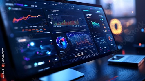 digital product and wealth concept. Modern Data Analytics Dashboard Displaying Colorful Graphs and Charts on a Computer Screen in a Dark Office Setting with City Lights in the Background