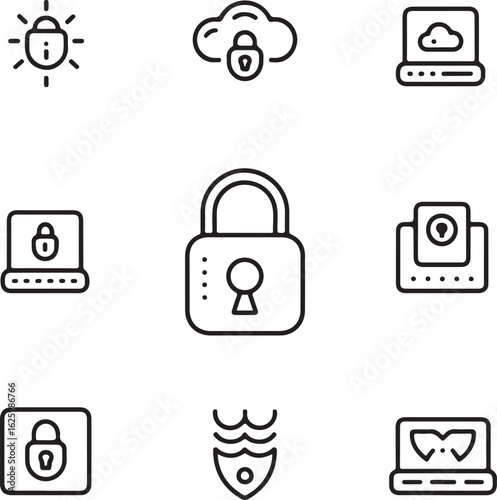 Digital Protection Icon Set – Cybersecurity and Secure Network Line Graphics