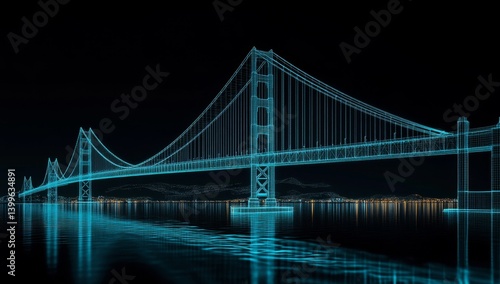 Digital rendering of a suspension bridge, illuminated with a cyan glow, over water reflecting the image, with mountains in the background