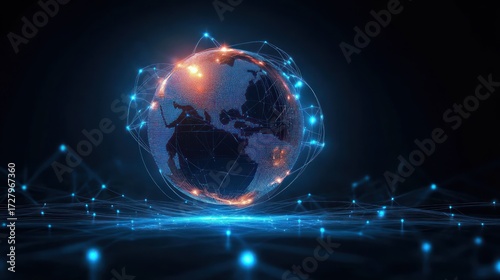 Digital representation of a glowing Earth with interconnected point networks symbolizing global communication and data flow against a dark background