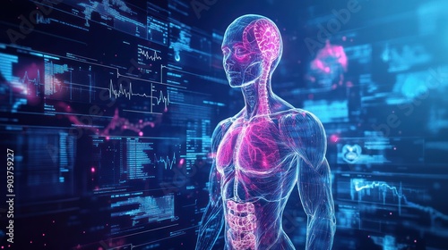 Digital Representation of a Human Body with Visible Organs and Muscles in Front of Data Screens