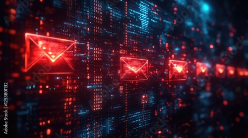 Digital representation of email communication with glowing red envelopes on a tech background.