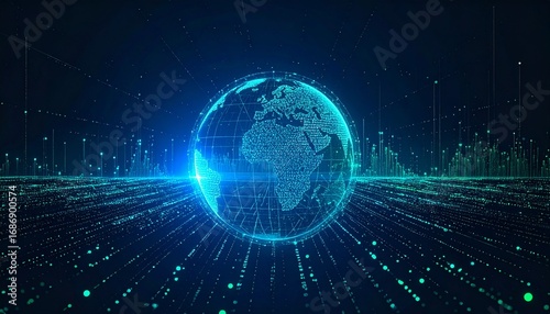 Digital representation of planet earth, showcasing global interconnectedness, data flow, and technological advancements.