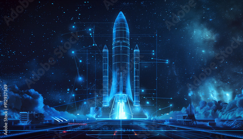Digital rocket launch into outer space boosting and takeoff career concept blue color