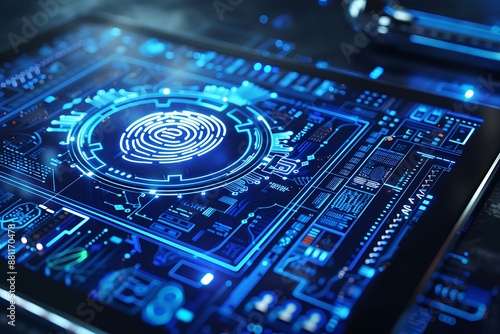 Digital safe and fingerprint scanning symbol on a tablet, bright blue highlights,