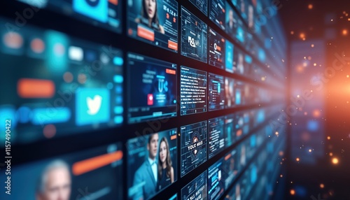 Digital screens display various info. Tech screens show data streams, social media feeds. Multi media content appears on dynamic digital displays. Modern tech environment. Global communication.