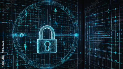 Digital security concept with glowing padlock, network lines, and abstract data stream