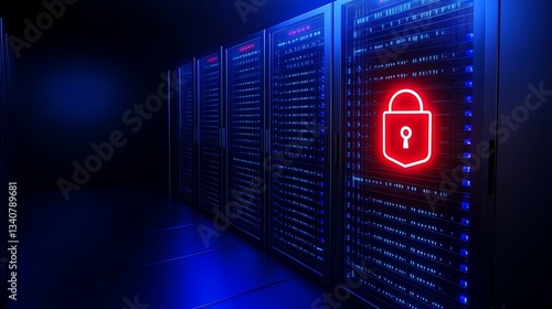 Digital Security Concept with Neon Lock Symbol in Data Center Surrounded by Modern Server Racks and Blue Lighting
