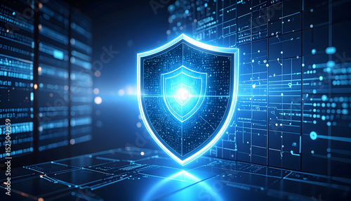 Digital shield symbol on futuristic interface with glowing elements