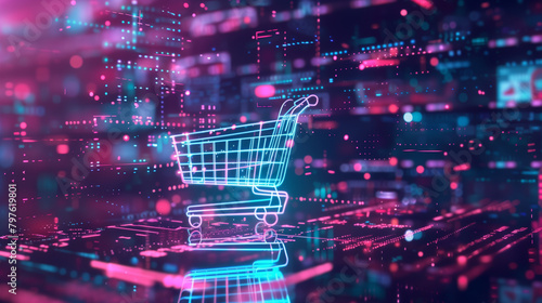 Digital Shopping Cart on Futuristic Neon Circuit Board Background