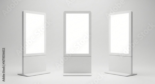Digital Signage Mockup: Three White Kiosks