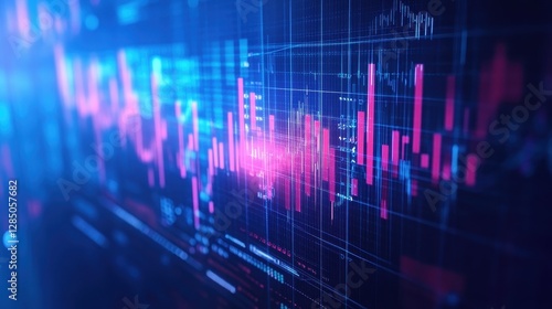 Digital stock market chart with step graph, rising bars representing investment growth, blue financial background, futuristic business analysis concept, economic trends visualization.