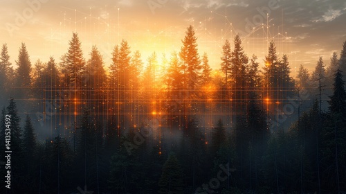 Digital Sunrise Over a Forest with Abstract Data Visualization Elements