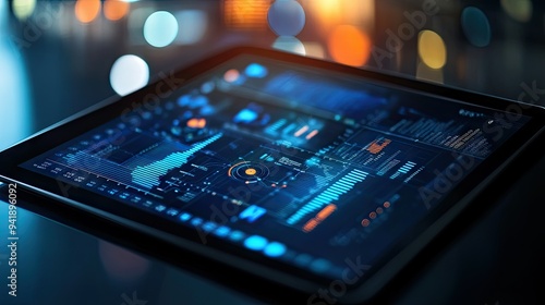 Digital tablet displaying a complex graph with analytics icons and technology overlays -