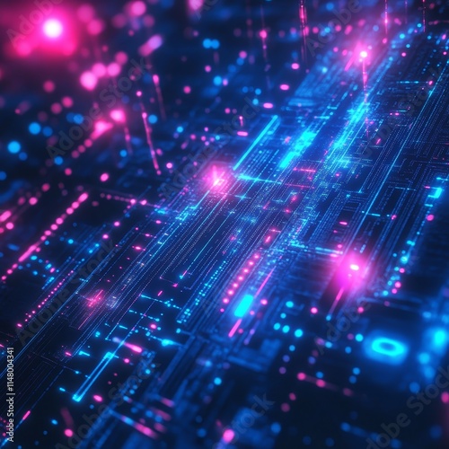 Digital Technology Abstract Design With Vibrant Blue and Pink Lights Illuminating a Futuristic Grid Pattern