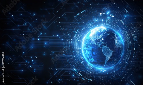 Digital technology background with a blue, glowing planet Earth and digital circuit board lights for a global internet, cyber security, or data transfer concept design Generative AI