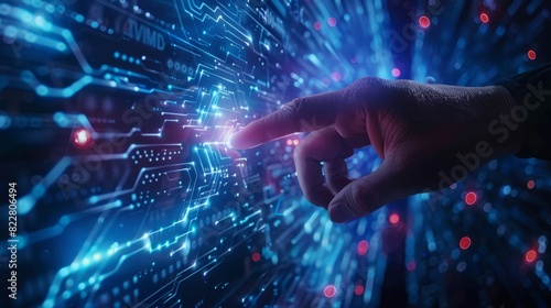 Digital technology, internet network connection concept. Finger touching on virtual screen with futuristic technology background, data exchange, digital transformation