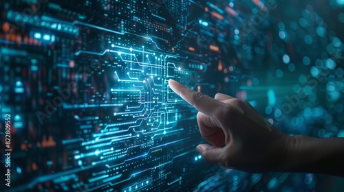 Digital technology, internet network connection concept. Finger touching on virtual screen with futuristic technology background, data exchange, digital transformation