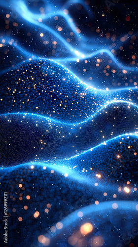 Digital technology waves, abstract blue and white background with glowing lines and dots. Modern tech-inspired visual style.
