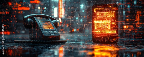 Digital telephony in telecommunication, visualizing the transition from analog to digital, with data encoding and processing.
