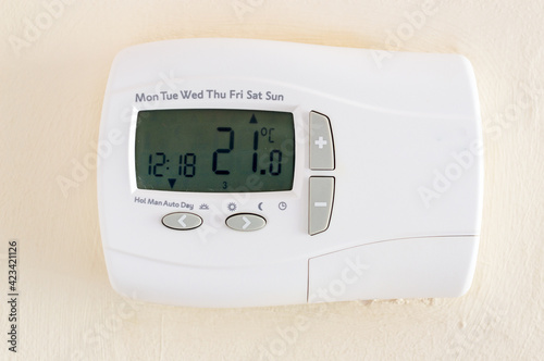 Digital thermostat mounted on wall displaying temperature in celcius