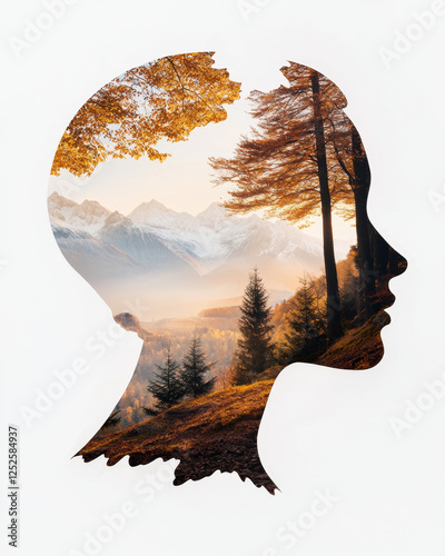 Digital transformation business model innovation. creative silhouette of head filled with scenic autumn landscape, showcasing mountains and trees