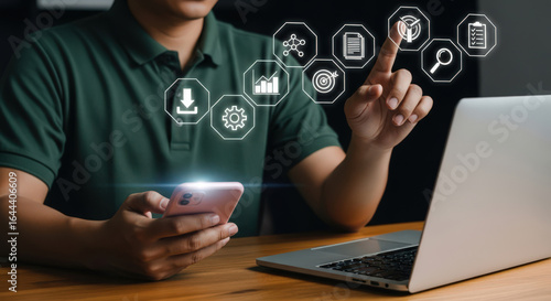 Digital Transformation Concept with Person Interacting with Virtual Icons Representing Business Processes and Technology Solutions for Efficiency and Productivity