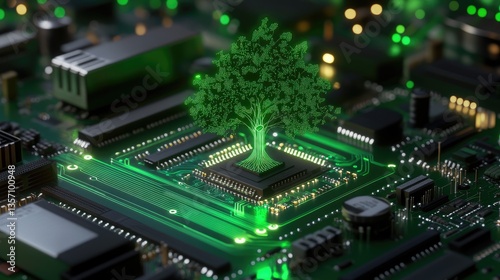 Digital Tree Growth on Circuit Board Symbolizing Eco Technology