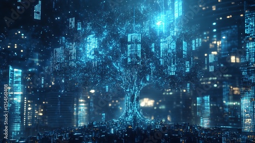 Digital Tree of Knowledge Illuminates Futuristic Cityscape