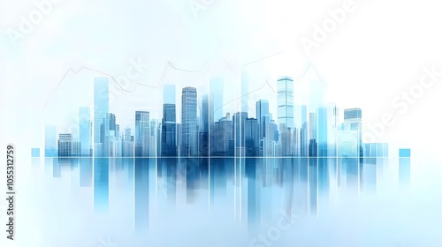 Digital Urban Economy Concept Showcasing City Skyline with Financial Data Visualizations and Progress Indicators in Futuristic Blue Transparency, Clean Polished Architectural Style for Modern Economy
