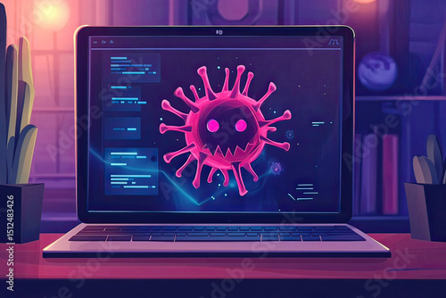 Digital visualization of coronavirus on laptop screen illustrating health and technology threat