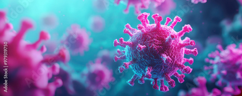 Digital visualization of virus mutation symptoms, showcasing vibrant pink and blue colors. This image captures intricate details of viral structures, emphasizing their complexity and impact