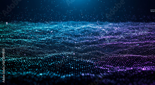Digital Wave of Innovation: A dynamic abstract composition of digital particles flows with an undulating motion. Evoking the fluid movement of information and data.