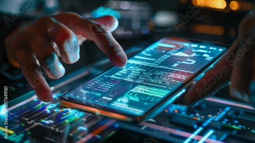 Digital Wealth Visualization Hands Pointing to Financial Assets and Liabilities on Holographic Smartphone Display