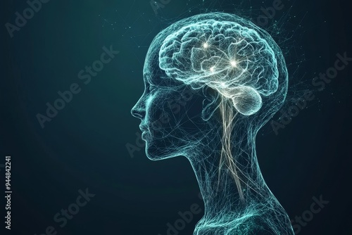 Digital wireframe of a human brain in profile symbolizing the intricate structure of thoughts and the complex neural connections that define cognitive processes