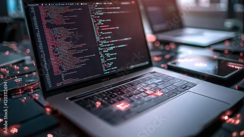 Digital workspace with coding on laptop and glowing technology elements