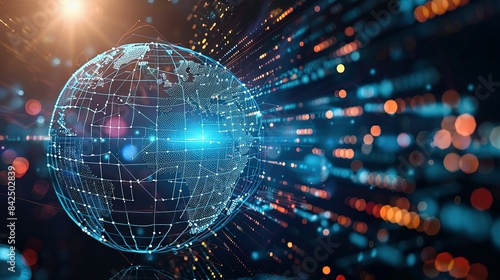 Digital world globe representing global network and connectivity on Earth, featuring high-speed data transfer, cyber technology, information exchange, and international telecommunications.