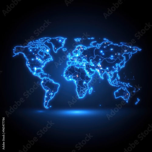 Digital world map illuminated with blue lights, representing global connectivity and technology in a modern, abstract style.