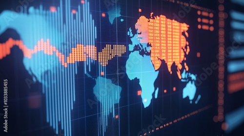 Digital world map with data visualization in vibrant colors, abstract technology design.
