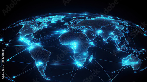 Digital world map with global network connections, blue glowing lines connecting the continents on a black background