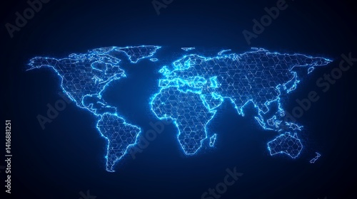 Digital World Map with Glowing Connectivity, Digital world map with glowing blue lines and hexagonal patterns on a dark background