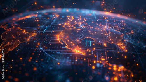 Digital world map with glowing networks, connecting continents representing global communication and technology connections in cyberspace.