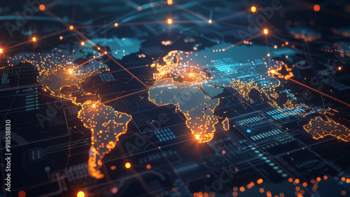 Digital World Map with Interconnected Nodes and Glowing Lights