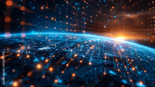 Digital world with a grid of data lines showing global telecommunication and IoT