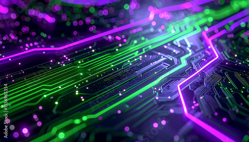 Digital world with vibrant green and purple neon lines flowing across a dark, futuristic circuit board, creating a complex electronic backdrop.