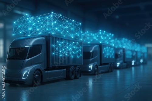 Digitalized Freight Transport: A futuristic scene showcases a convoy of high-tech trucks, with a connected network of digital data points, highlighting smart logistics and automation.