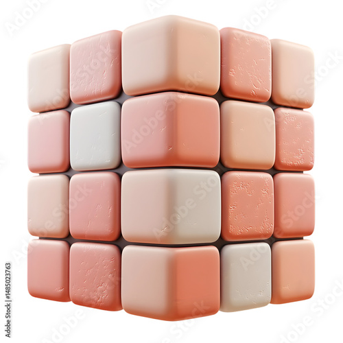 Digitally rendered, geometric cube comprised of small, textured squares in pastel shades of pink, peach, and beige.