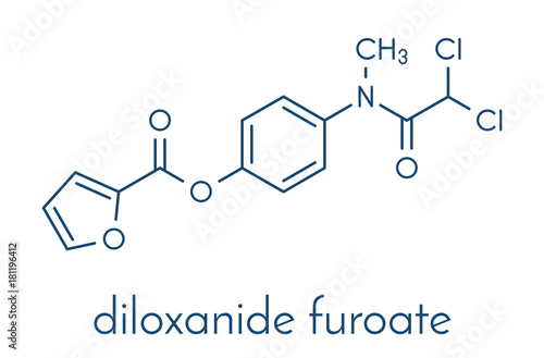 Diloxanide furoate amoebiasis drug molecule. Used in treatment of Entamoeba histolytica infections. Skeletal formula.