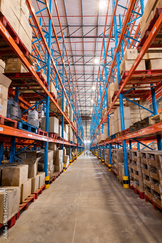 Diminishing perspective of flooring amidst shelves with cardboard boxes in distribution warehouse